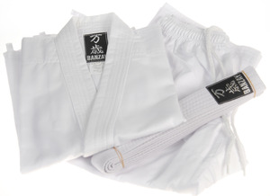 חגורה קראטה/ג'ודו לבן 310 ס"מ JUDO BELT LMS + חליפת ג'ודו כחולה מידה BANZAY 3 + חליפת קראטה שחורה מידה BANZAY 1 + חליפת קראטה מידה 1 לבן BANZAY =
